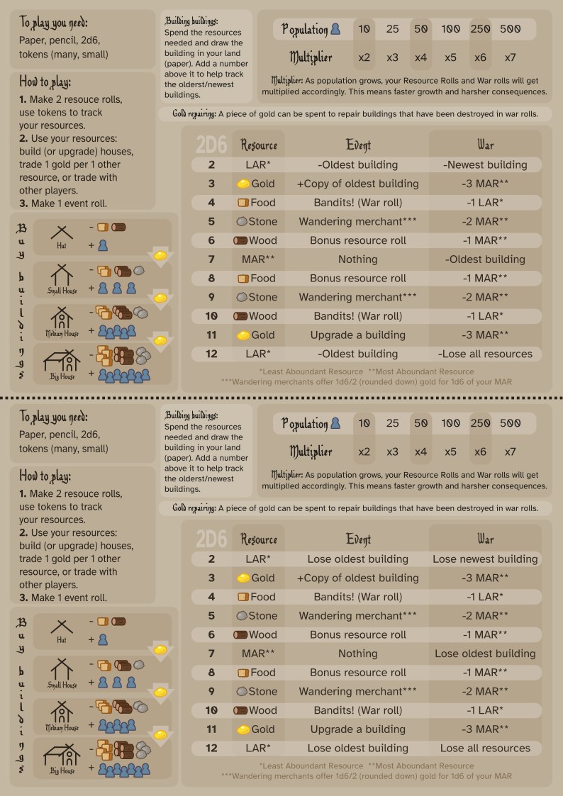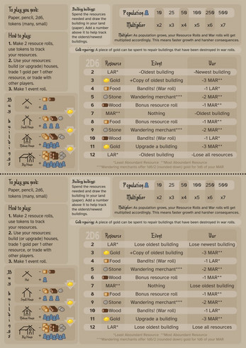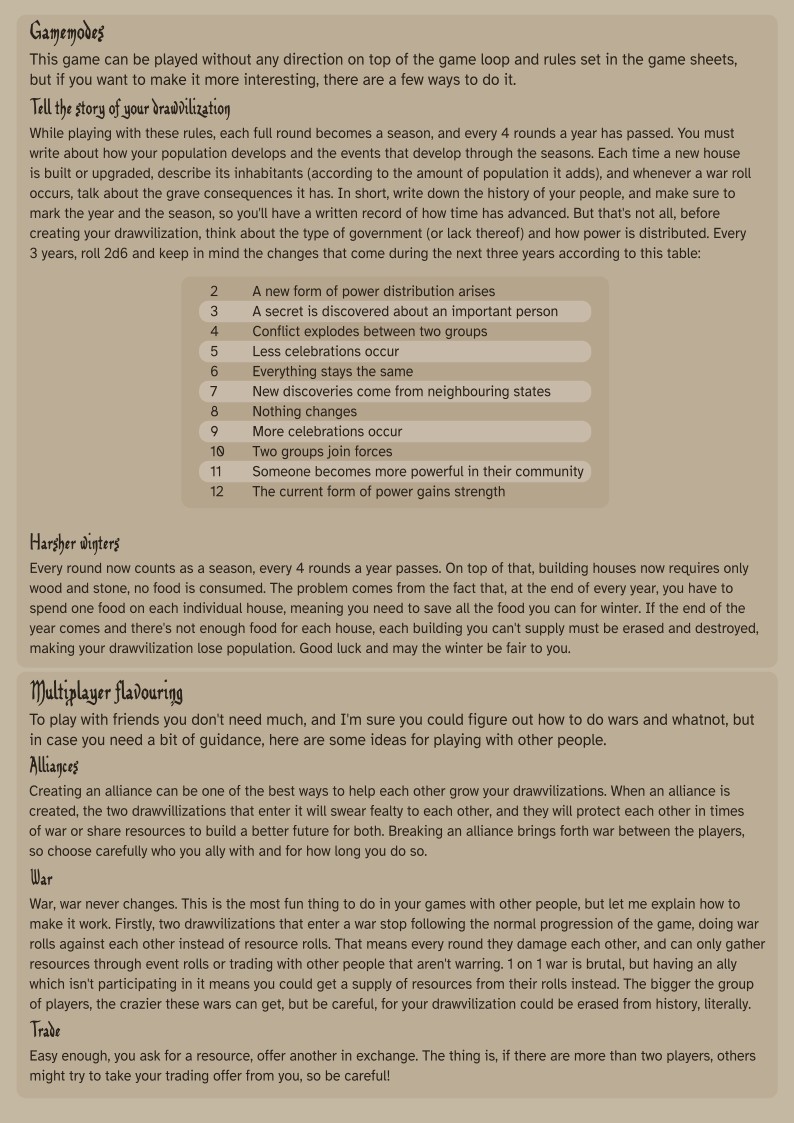 This is a game about getting resources and building a civilization (or rather a drawvilization cause you draw your buildings on a piece of paper). The idea is to make a sort of simplified Catan that barely needs resources and which can be open to modifications and homebrews. You can modify the base game however you want, although there are two game modes that come with the system already :) There's no clear ending to the game, so really is up to you to decide the winning conditions.