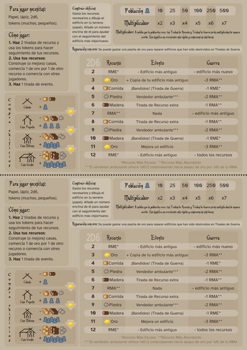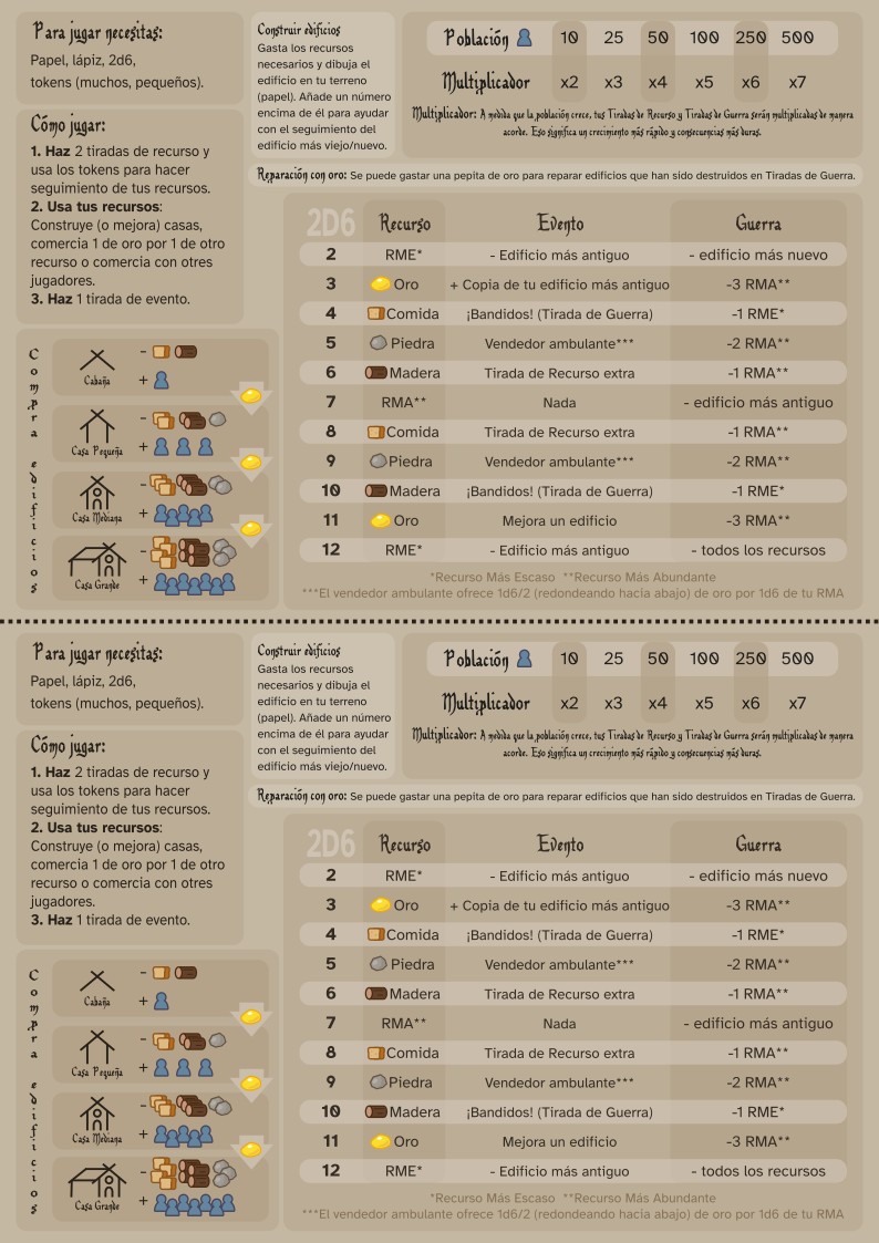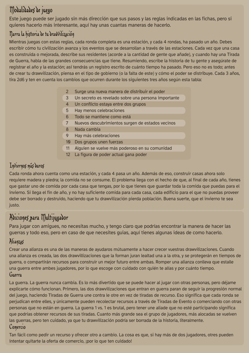 Este juego va de conseguir recursos y construir una civilización (o más bien una drawvilización, porque dibujas tus edificios en un papel). La idea es hacer una especie de Catan simplificado que a penas necesita recursos, y que pueda estar abierto a modificaciones y homebrews. Puedes modificar el juego base de la manera que quieras, aunque hay dos modos de juego extra que ya vienen con el sistema :) No hay un final claro para el juego, así que ya decidirás tú cuáles son las condiciones de victoria.