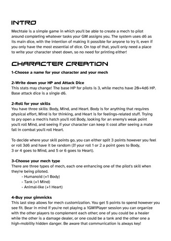 This is Mechtale! A game in which you'll be able to create a mech to pilot around completing whatever tasks your GM assigns you. The system uses d6 as its main dice, with the intention of making it possible for anyone to try it, even if you only have the most essential of dice. On top of that, you'll only need a place to write your character sheet down, so no need for printing either!