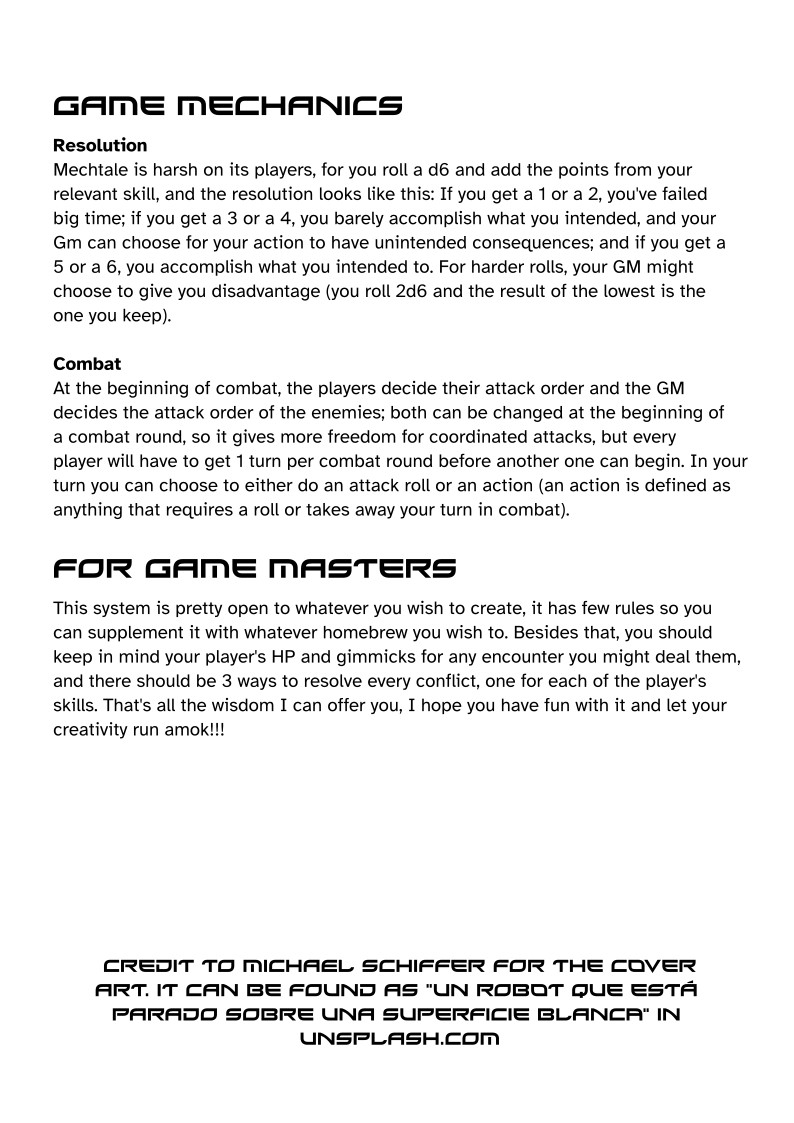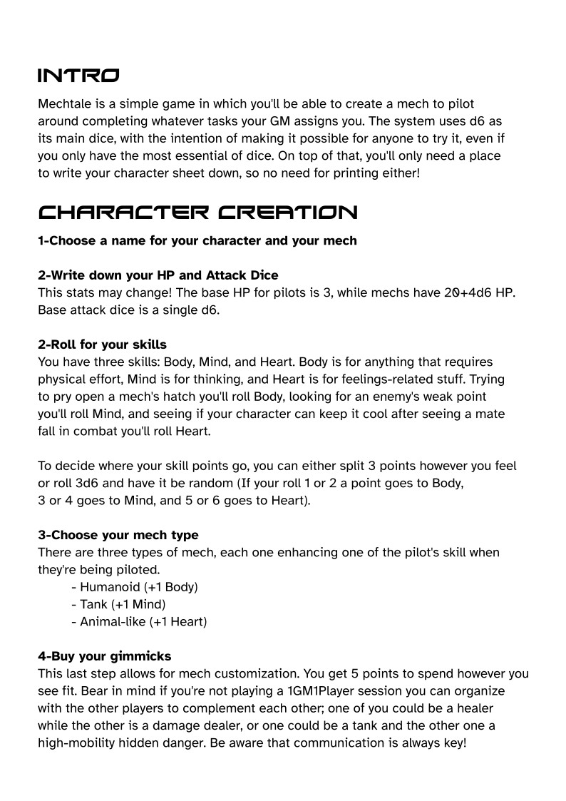 Thank you for your playtesting! Any input regarding how the system works at the moment is greatly appreciated. I'm glad to hear the simplicity is not a problem, for I wanted to focus on it so that Mechtale can be a system you can pick up without much experience :D